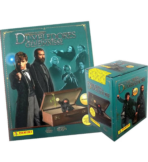 Album + Display mit 36 Tüten aus der “Panini Phantastische Tierwesen: Dumbledores Geheimnisse ” Sticker & Cards Kollektion. Jede Tüte enthält 4 Sticker + 1 Trading Card.