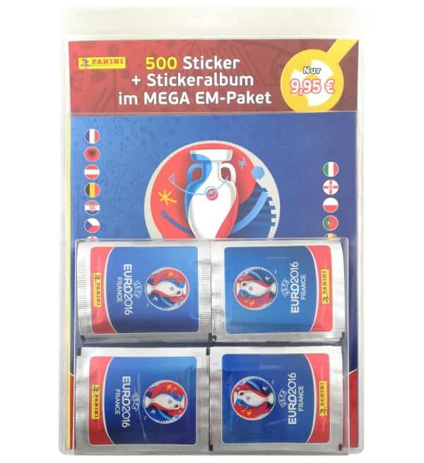 Mega Pack zur Panini EURO 2016 Sticker-Kollektion mit 100 Tüten und einem Leeralbum in der deutschen Version. Jede Tüte enthält 5 Sticker, somit sind 500 Sammelbilder in dem Mega WM-Paket enthalten.