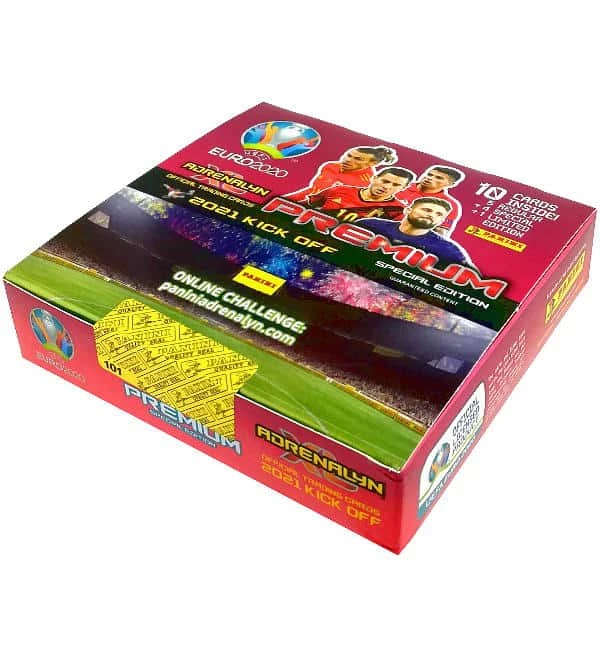 Ein Premium Display mit 10 Tüten der Panini EURO 2020 Adrenalyn XL 2021 KICK OFF PREMIUM Special Edition. Jede Tüte enthält 10 Karten: