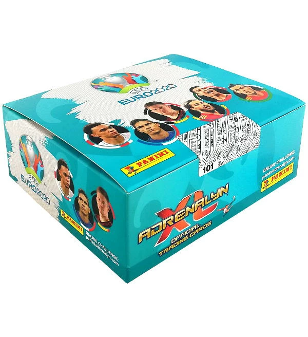 Ein original verpacktes, ungeöffnetes Display mit 24 Tüten der Panini EURO 2020 Adrenalyn XL Trading Card Serie. Jede Tüte enthält 8 Karten, so dass in der Box insgesamt 192 Cards enthalten sind.