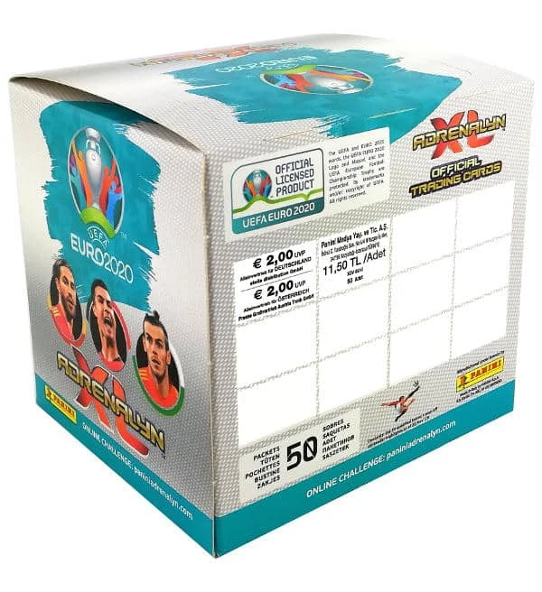 Ein original verpacktes, ungeöffnetes Display mit 50 Tüten der Panini EURO 2020 Adrenalyn XL Trading Card Serie. Jede Tüte enthält 8 Karten, so dass in der Box insgesamt 400 Cards enthalten sind.