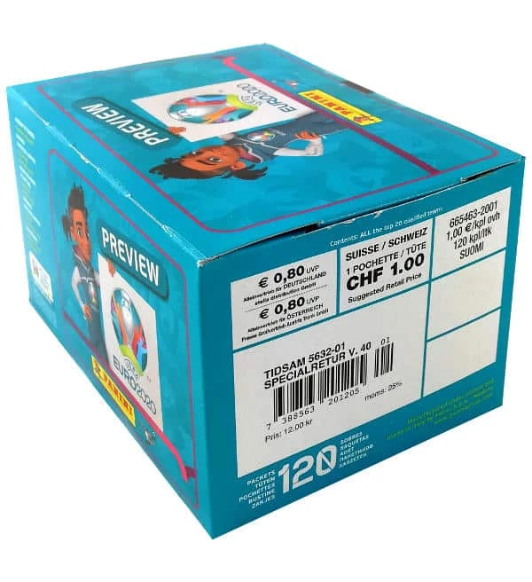Ein Display mit 120 Tüten der Panini EURO 2020 Preview Sticker-Kollektion. Jede Tüte enthält 5 Sammelbilder, so dass in der Box insgesamt 600 Sticker enthalten sind.