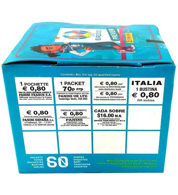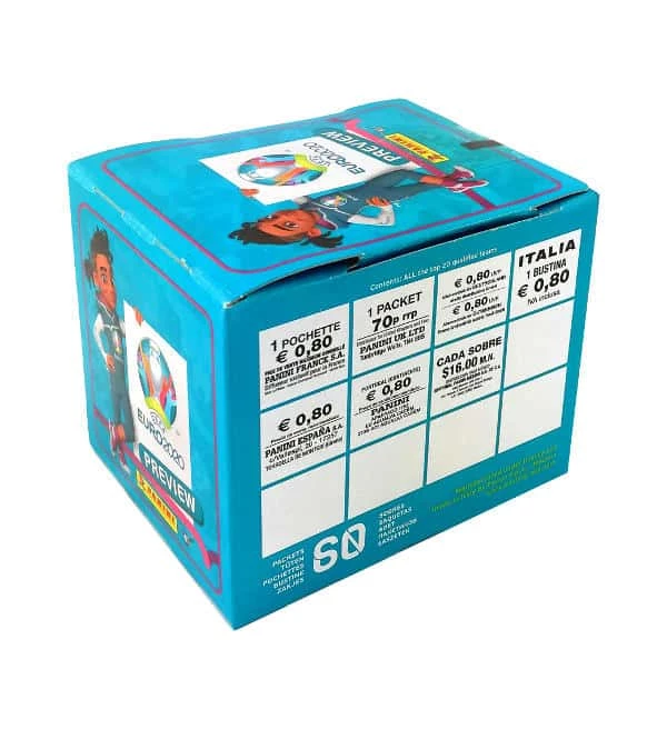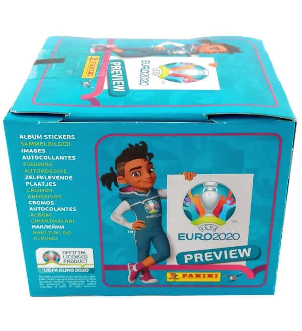 Ein Display mit 60 Tüten der Panini EURO 2020 Preview Sticker-Kollektion. Jede Tüte enthält 5 Sammelbilder, so dass in der Box insgesamt 300 Sticker enthalten sind.