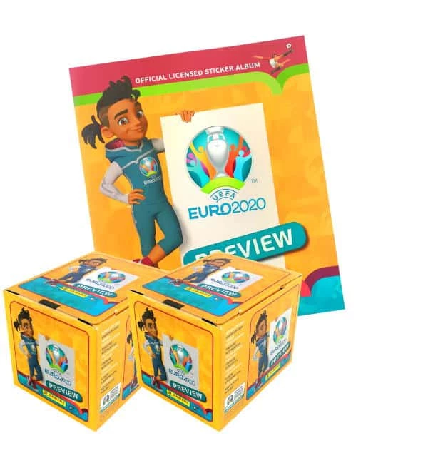 1 Album + 2 Displays mit jeweils 60 Tüten der internationalen Version der “Panini EURO 2020 Preview Sticker-Kollektion”. Jede Tüte enthält 5 Sammelbilder, so dass in diesem Angebot insgesamt 600 Sticker enthalten sind.