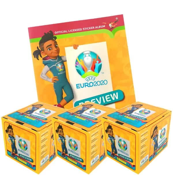1 Album + 3 Displays mit jeweils 60 Tüten der internationalen Version der “Panini EURO 2020 Preview Sticker-Kollektion”. Jede Tüte enthält 5 Sammelbilder, so dass in diesem Angebot insgesamt 900 Sticker enthalten sind.