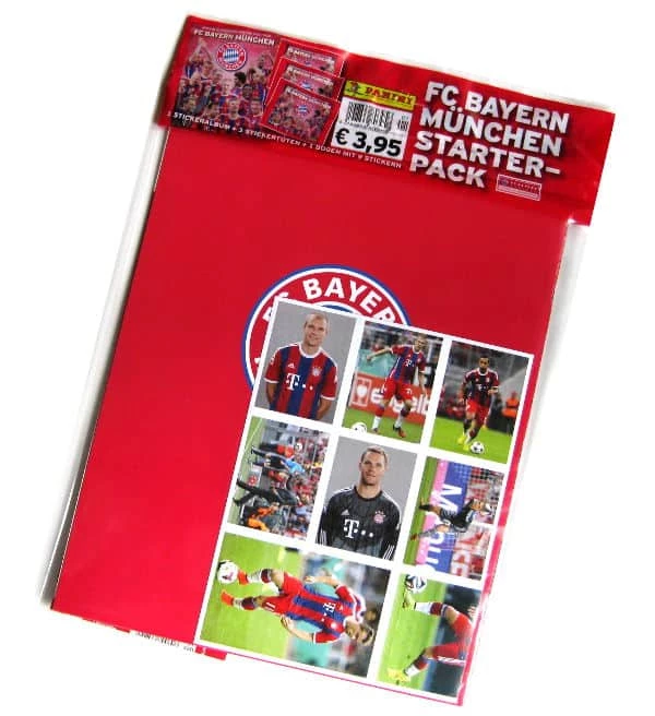 Starter-Pack zur offiziellen Panini Sticker-Kollektion FC Bayern München 2014/2015. In dem Starterset sind ein Panini Album + 3 Tüten mit je Bildern + 1 Bogen mit 9 Stickern des FC Bayern München 2014/15 enthalten.