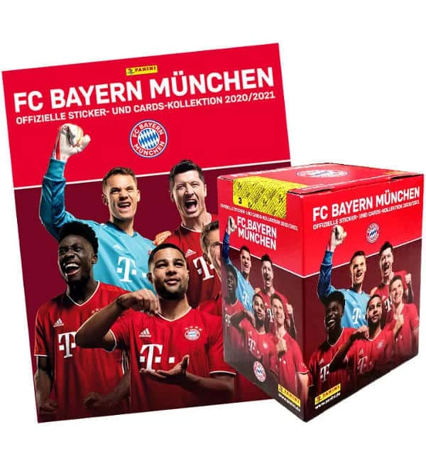 1 Album + 1 Display mit 36 Tüten zur Panini FC Bayern München 2020/2021 Sticker- und Cards-Kollektion. Jede Tüte enthält 4 Sticker + 1 Trading Card.