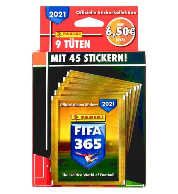 Blister mit 9 Tüten (=45 Sticker) aus der Panini FIFA 365 2021 Sticker-Kollektion.