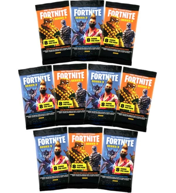 10 Booster der Panini Fortnite Series 3 Trading Cards Kollektion. Jeder Booster enthält 8 Karten.