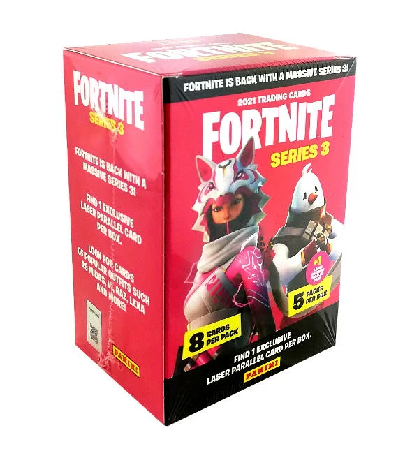 Blaster Box der Panini Fortnite Series 3 Trading Cards Kollektion mit 5 Boostern (=40 Karten) + 1 LASER RAINBOW SPOKES PARALLEL CARD. Insgesamt sind in der Blaster Box 41 Sammelkarten enthalten.