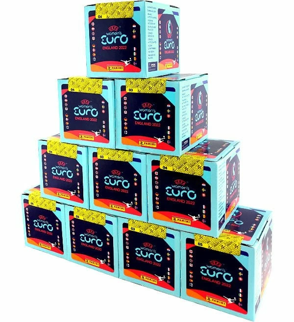 10 Displays mit insgesamt 500 Tüten aus der “Panini Frauen EM 2022” Sticker-Kollektion. Jede Tüte enthält 5 Sammelbilder.