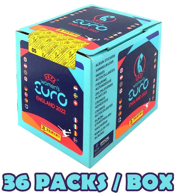 Display mit 36 Tüten aus der “Panini Frauen EM 2022” Sticker-Kollektion. Jede Tüte enthält 5 Sammelbilder.