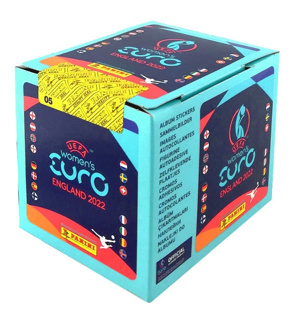Display mit 50 Tüten aus der “Panini Frauen EM 2022” Sticker-Kollektion. Jede Tüte enthält 5 Sammelbilder.