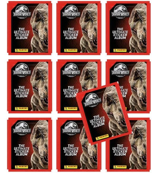 10 Tüten zur offiziellen Panini Jurassic World Anthology Sticker- und Cards-Kollektion. Jede Tüte enthält 4 Sticker + 1 Trading Card.