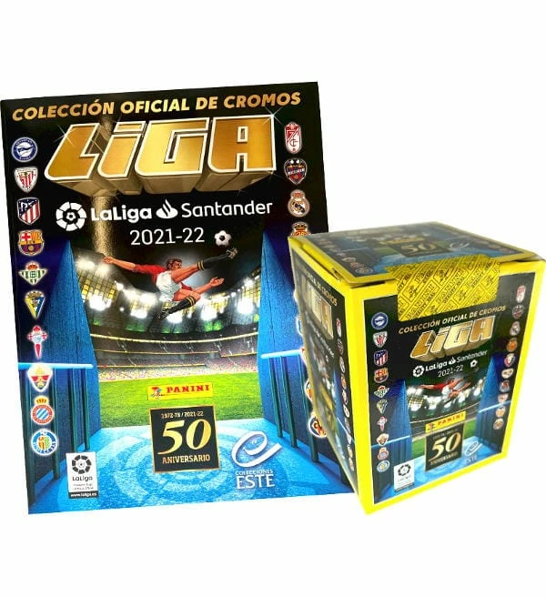 1 Album + 1 Display mit 50 Tüten zur “Panini LaLiga 2021/2022” Sticker-Kollektion. Jede Tüte enthält 6 Sticker zur Primera División. Das Album hat 104 Seiten und es können insgesamt 621 Sticker gesammelt werden. Diese Kollektion ist zur Saison 21/22 der Primera División und feiert das 50-jährige “Panini LaLiga-Jubiläum”.