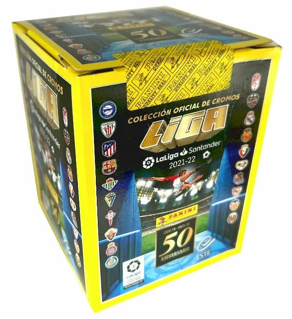 1 Display mit 50 Tüten zur “Panini LaLiga 2021/2022” Sticker-Kollektion. Jede Tüte enthält 6 Sticker zur Primera División.
