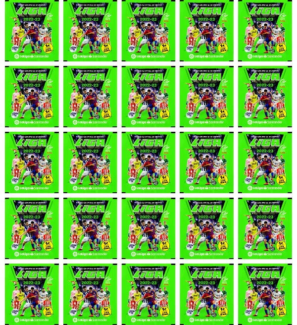 25 Tüten zur “Panini LaLiga 2022/2023” Sticker-Kollektion. Jede Tüte enthält 8 Sticker zur Primera División.