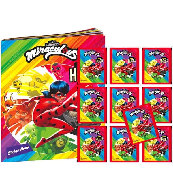 1 Album + 10 Tüten zur Panini Miraculous “Super Heroez Team” Sticker- und Cards-Kollektion. Jede Tüte enthält 4 Sticker + 1 Trading Card.