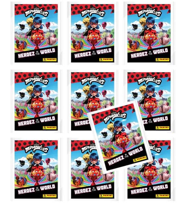 10 Tüten zur “Panini Miraculous – Superhelden erobern die Welt” Sticker- und Cards-Kollektion. Jede Tüte enthält 4 Sticker + 1 Trading Card.