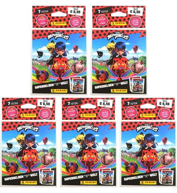 5 Blister mit insgesamt 35 Tüten + 5 LE Cards zur “Panini Miraculous – Superhelden erobern die Welt” Sticker- und Cards-Kollektion. Jede Tüte enthält 4 Sticker + 1 Trading Card.