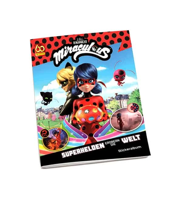 Sammelalbum zur “Panini Miraculous – Superhelden erobern die Welt” Sticker- und Cards-Kollektion mit 32 Innenseiten + 6er Stickerbogen + Folder + Sammelbox. Insgesamt können 192 Sticker + 50 Trading Cards + 4 LE Cards gesammelt werden.