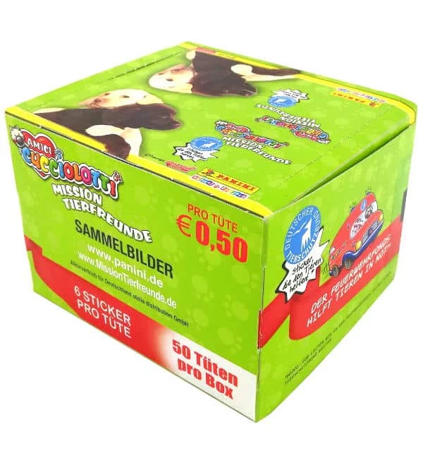 Display mit 50 Tüten aus der “Mission Tierfreunde” Sticker-Kollektion von Panini. Jede Tüte enthält 6 Sammelbilder.