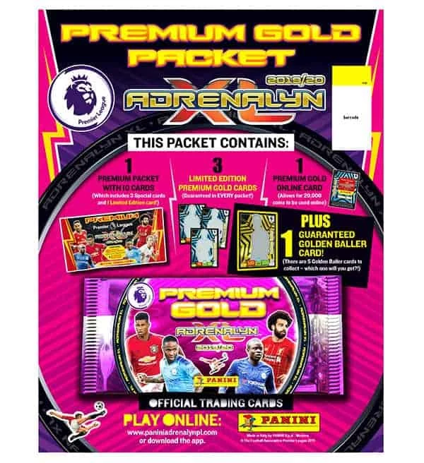 Premium GOLD Packet aus der Panini Premier League 2019-2020 Adrenalyn XL Kollektion. Eine Packung Premium GOLD enthält: