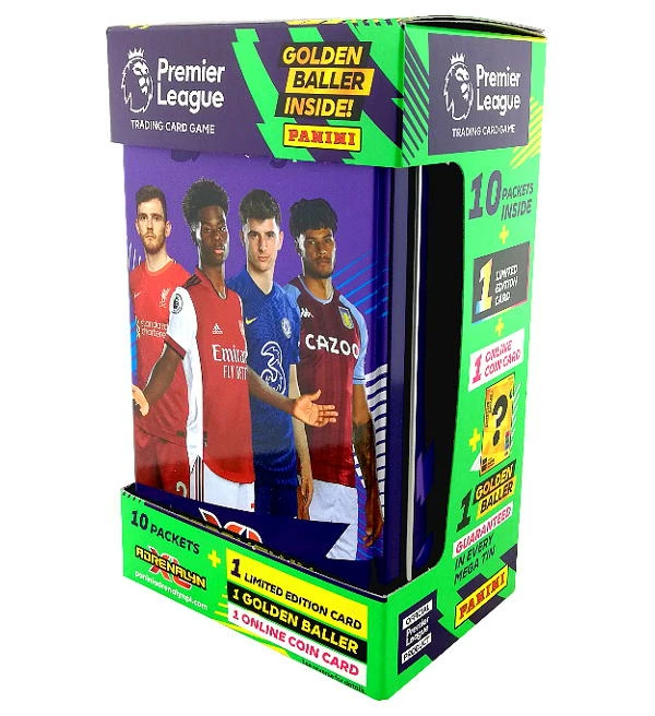 Tin “Lila” aus der “Panini Premier League 2021/22 Adrenalyn XL” Trading Cards Kollektion. Die Classic Tin enthält 48 Karten + 1 Limited Edition Card + 1 Golden Baller Card.