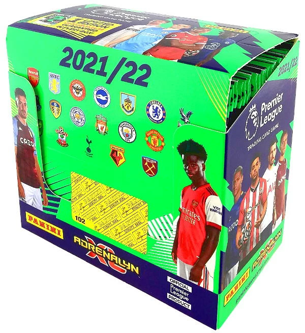 Ein Display mit 50 Boostern der Panini Premier League 2021/22 Adrenalyn XL Trading Cards Kollektion. Jeder Booster enthält 6 Karten, somit sind in der Box insgesamt 300 Cards enthalten.
