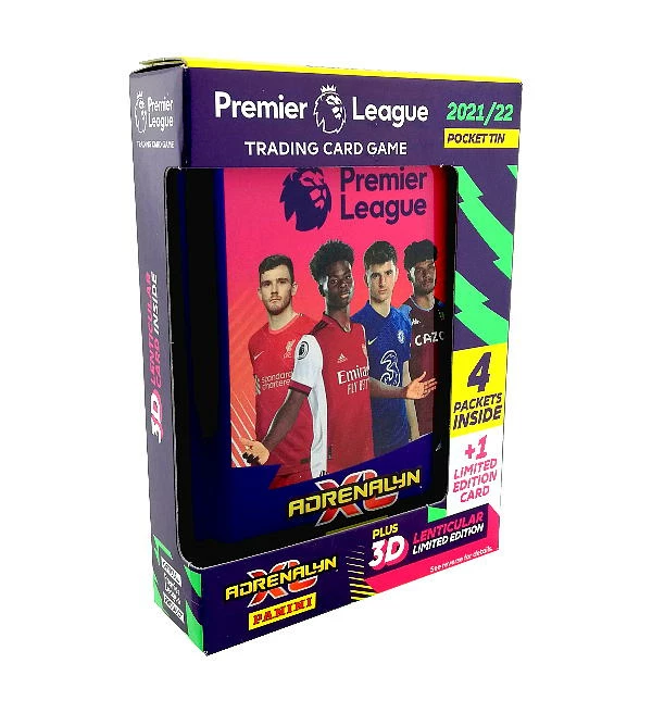 Pocket Tin “Pink” aus der “Panini Premier League 2021/22 Adrenalyn XL” Trading Cards Kollektion. Die Pocket Tin enthält 25 Karten + 1 Lenticular Limited Edition Card + 1 Limited Edition Card.
