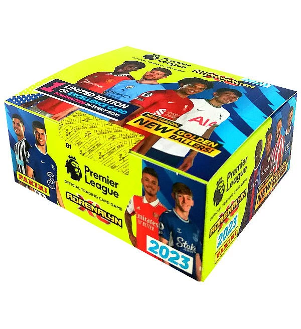 Ein Display mit 36 Boostern der Panini Premier League 2023 Adrenalyn XL Trading Cards Kollektion. Jeder Booster enthält 6 Karten, somit sind in der Box insgesamt 216 Cards enthalten.