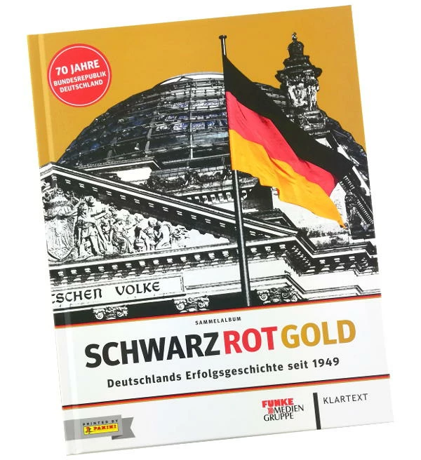 Hardcover Album zur Panini Sticker-Kollektion “Schwarz Rot Gold” mit 59 Seiten für insgesamt 333 Sticker zum Sammeln. 70 Jahre Bundesrepublik Deutschland. Deutschlands Erfolgsgeschichte seit 1949 auf 333 Stickern zum Sammeln, Kleben und Tauschen.