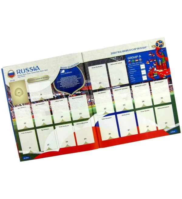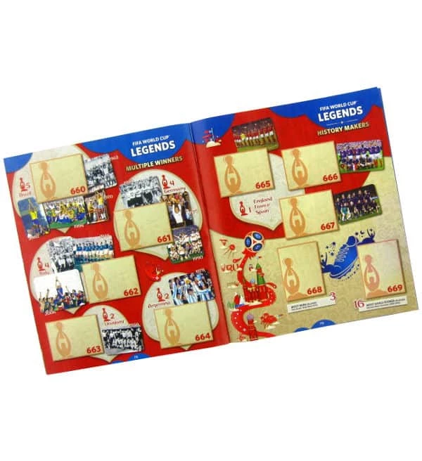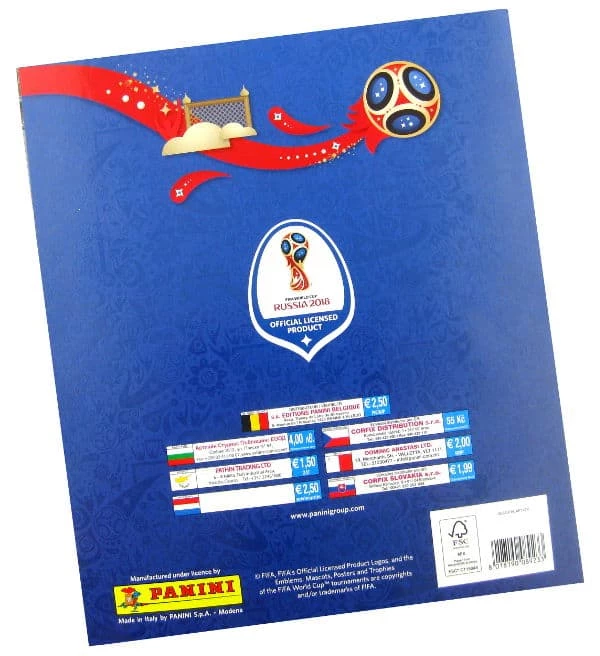 Internationale 670er Version des Panini WM 2018 Albums. Im Gegensatz zum deutschen und österreichischen Album (682 Sticker) finden in dieser Version nur 670 Sammelbilder platz. Es fehlen die Seiten mit den Postern der 12 Spielorte (Nr. 20-31 im deutschen Album). Diese Version ist für folgende Länder geeignet: