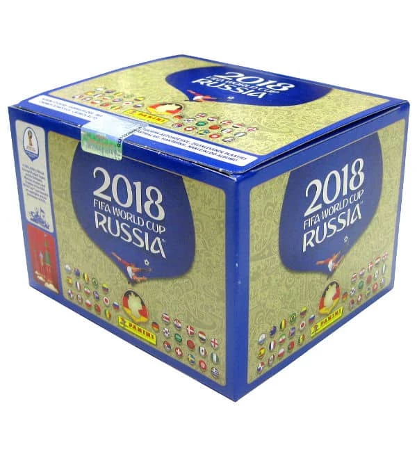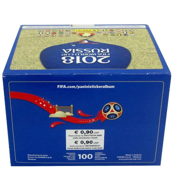 Box mit 100 Tüten zur Panini WM 2018 Sticker Kollektion. Jede Tüte enthält 5 Sticker; somit sind 500 Sammelbilder in dem in Folie eingeschweißten Display enthalten. Dies ist die Version für Deutschland, Österreich und Mitteleuropa mit insgesamt 682 Sammelbildern.