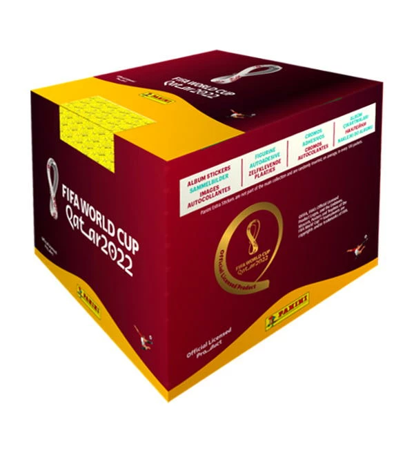 1 Display International mit 50 Tüten (Version 638) der Panini World Cup Qatar 2022 Sticker-Kollektion. Jede Tüte enthält 5 Sammelbilder.