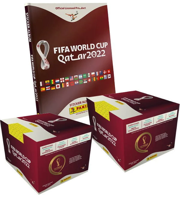 1 Hardcover Album + 2 Displays mit jeweils 100 Tüten der Panini World Cup Qatar 2022 Sticker-Kollektion. Jede Tüte enthält 5 Sammelbilder.