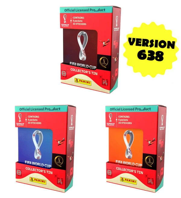 Set mit 3 Pocket Tins (Version 638) der “Panini World Cup 2022” Sticker Kollektion. Jede Pocket Tin enthält 6 Tüten. Diese 3 Motive sind enthalten: