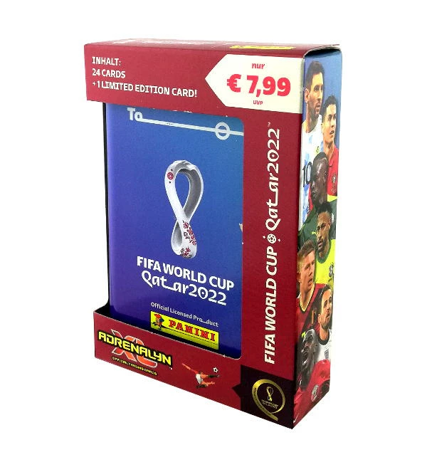 Pocket Tin Blau der “Panini World Cup 2022 Adrenalyn XL” Trading Cards Kollektion. Jede Pocket Tin enthält 24 Karten + 1 Limited Edition Card (Paulo Dybala).