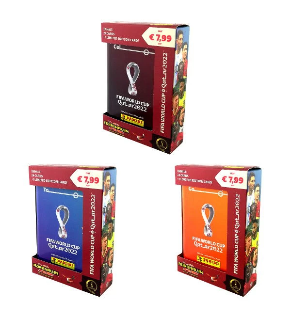 Set mit 3 Pocket Tins der “Panini World Cup 2022 Adrenalyn XL” Trading Cards Kollektion. Jede Pocket Tin enthält 24 Karten + 1 Limited Edition Card (Paulo Dybala). Diese 3 Motive sind enthalten: